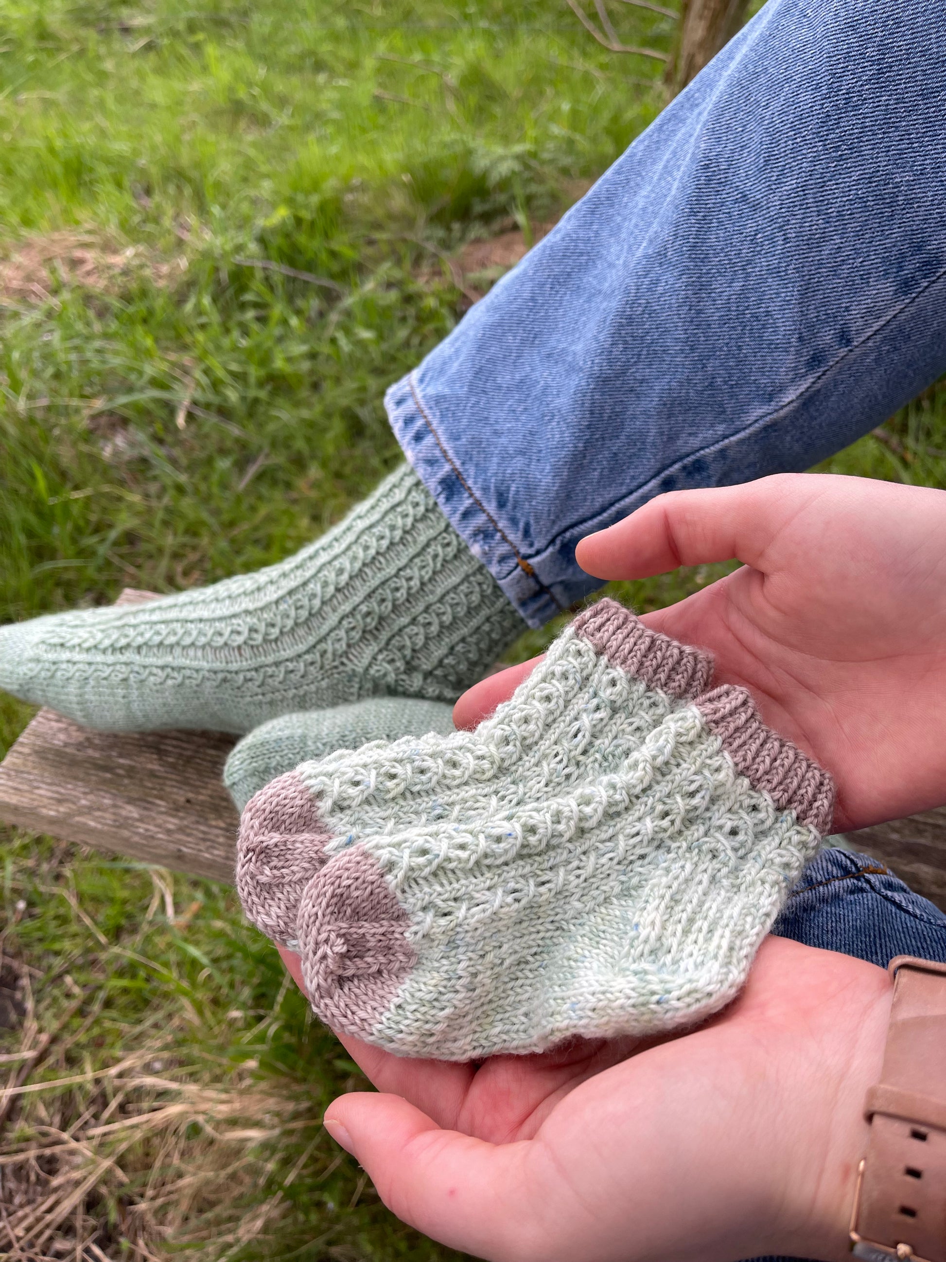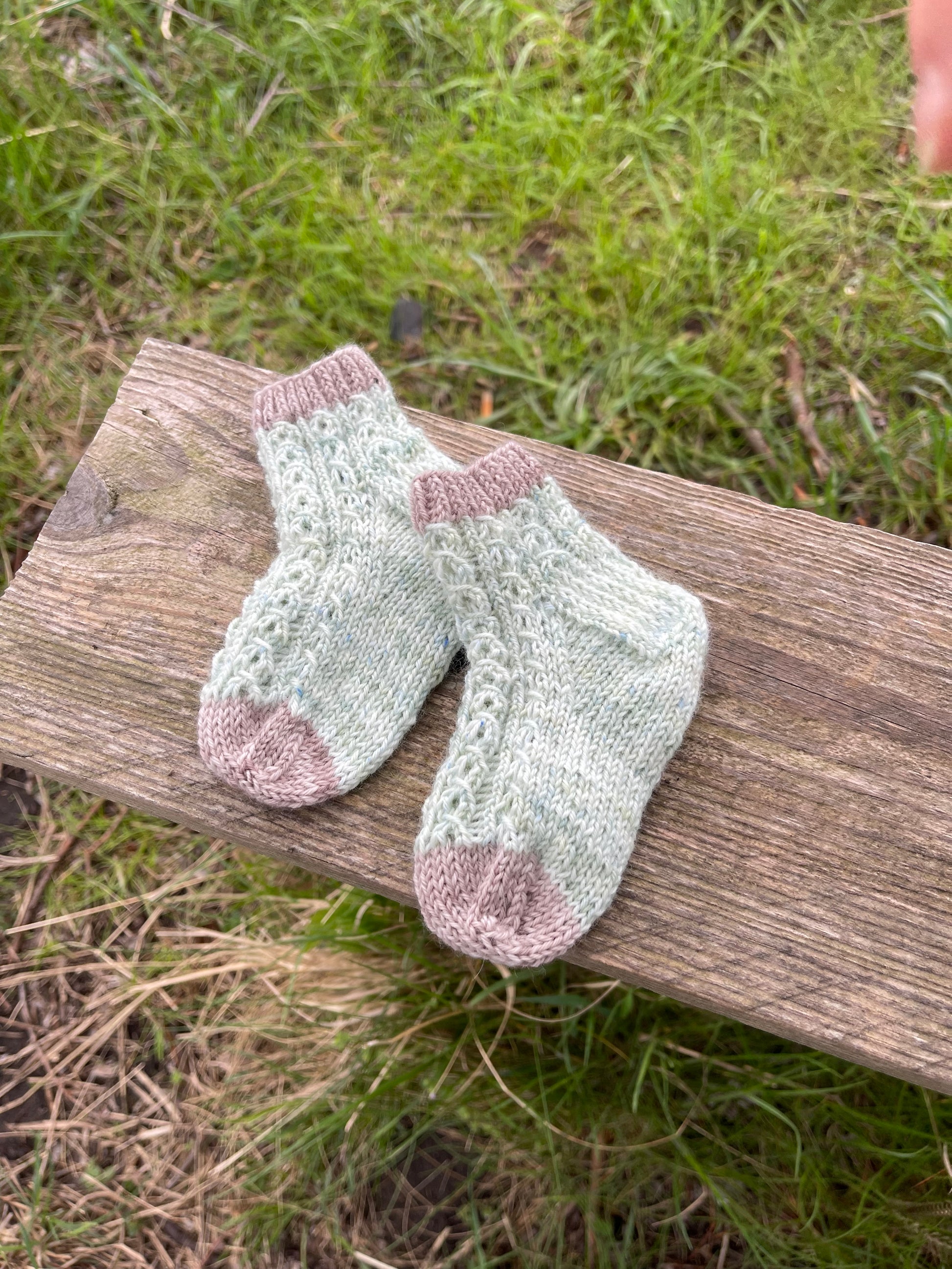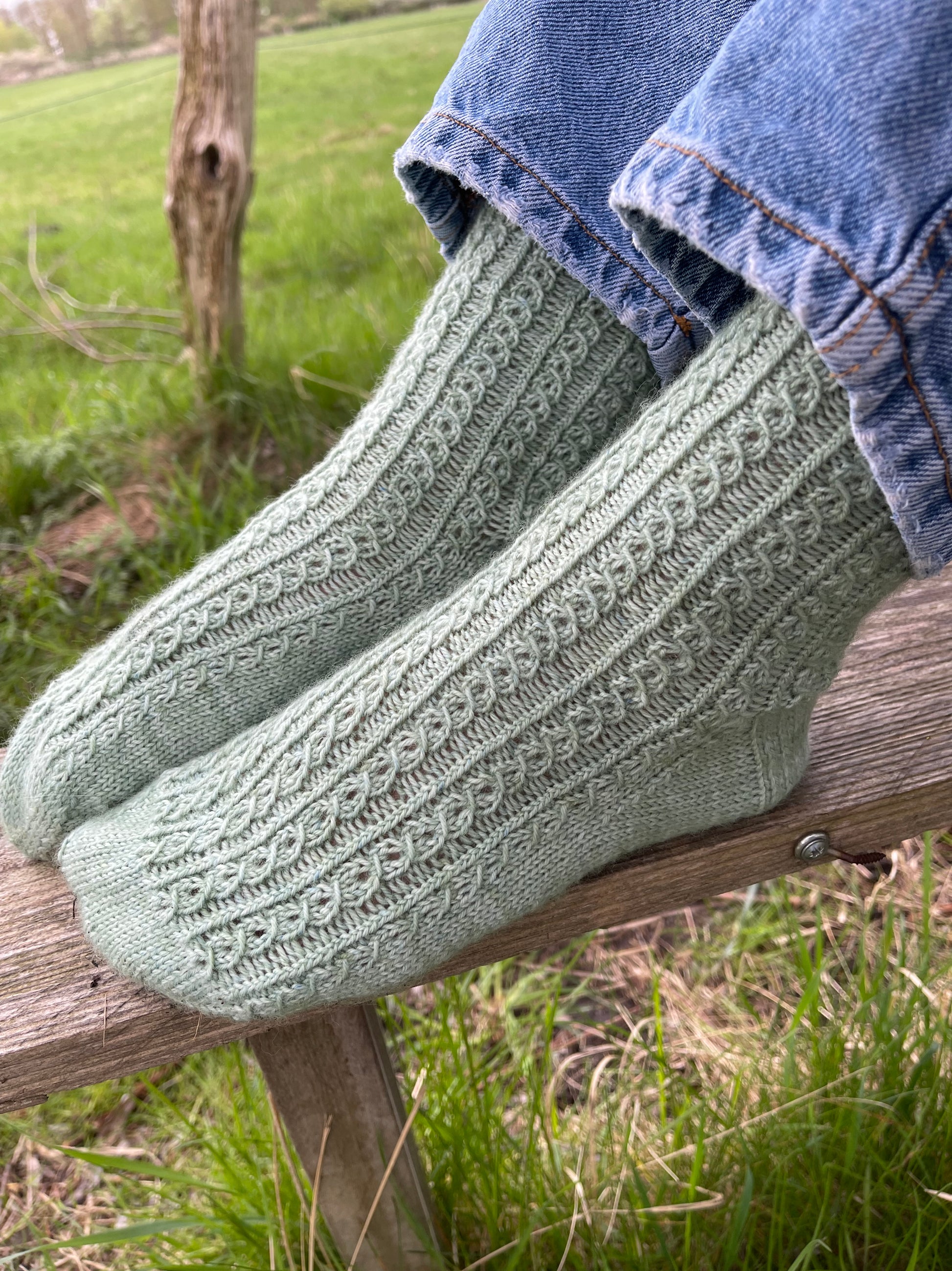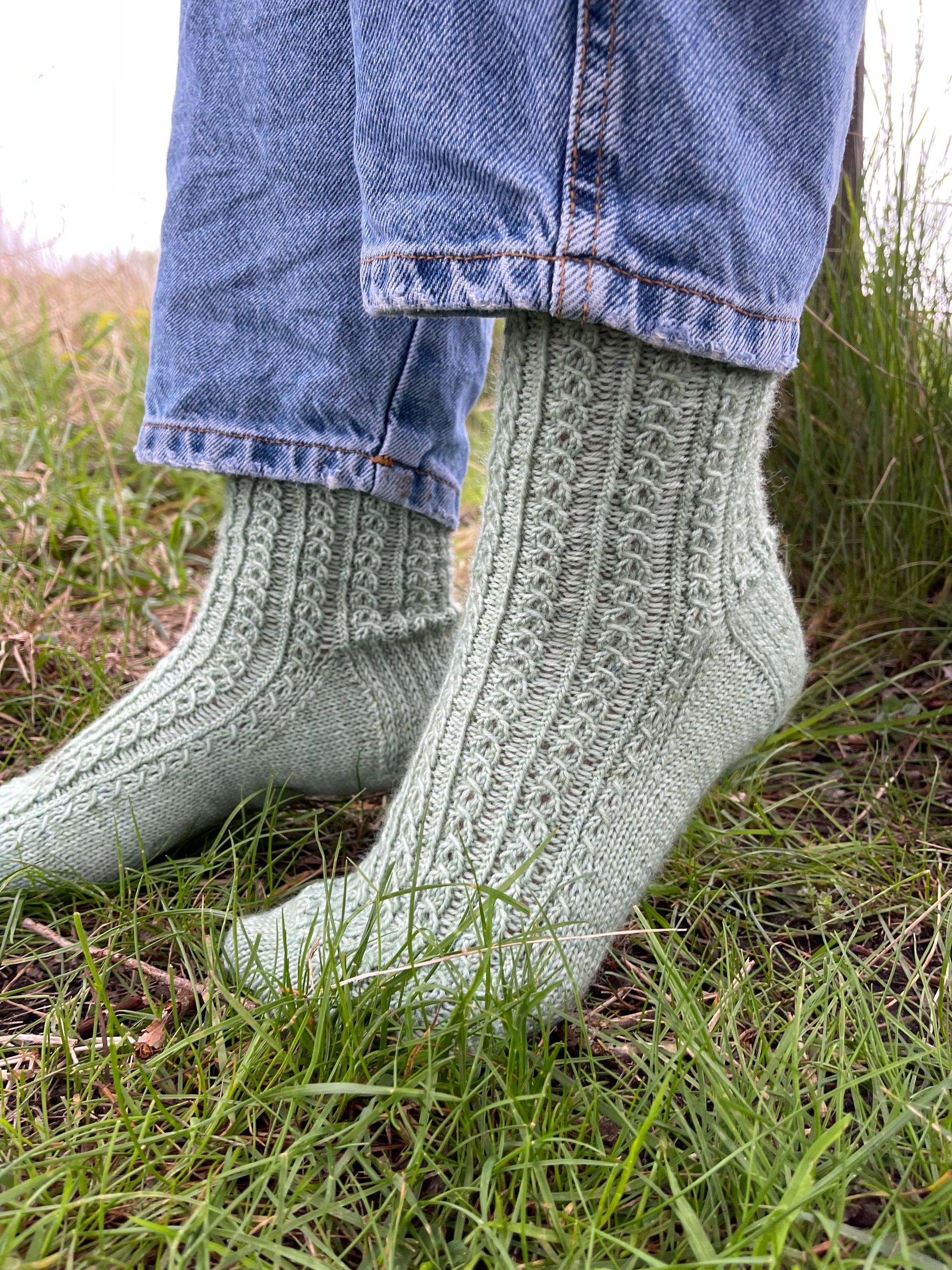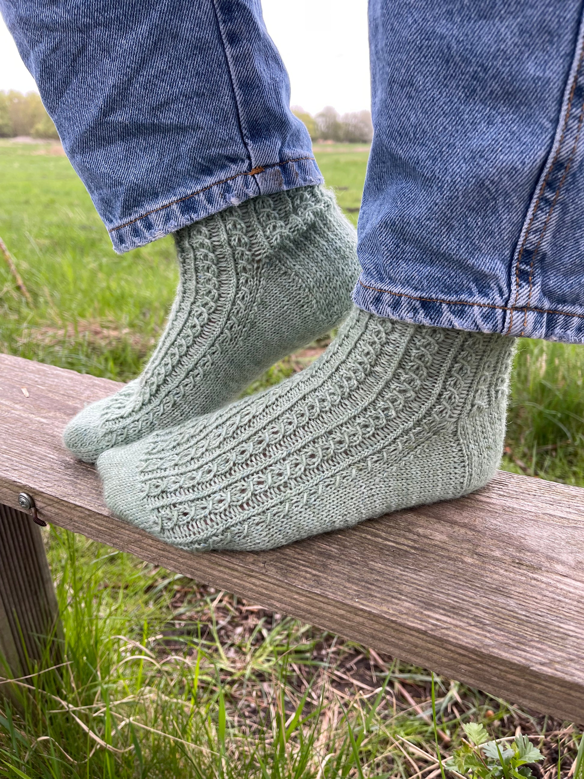 CONSTRUCTION: Ingesocks are knitted from the top down. First the cuff, then the patterned upper. Next comes the reinforced heel panel and heel cap. Then the gusset is knitted. The foot remains in the pattern until the toe is formed with decreases and closed with a slip stitch.