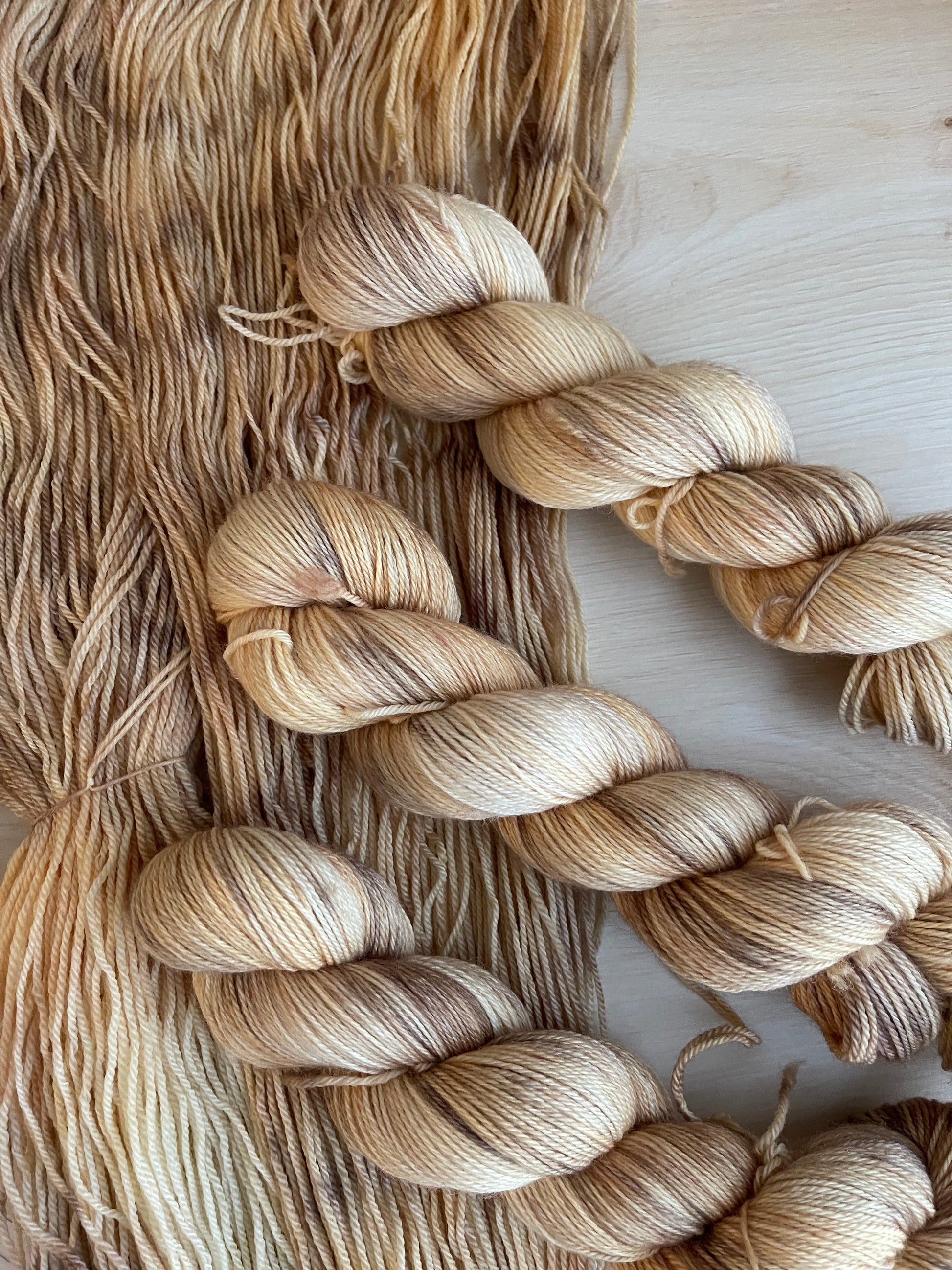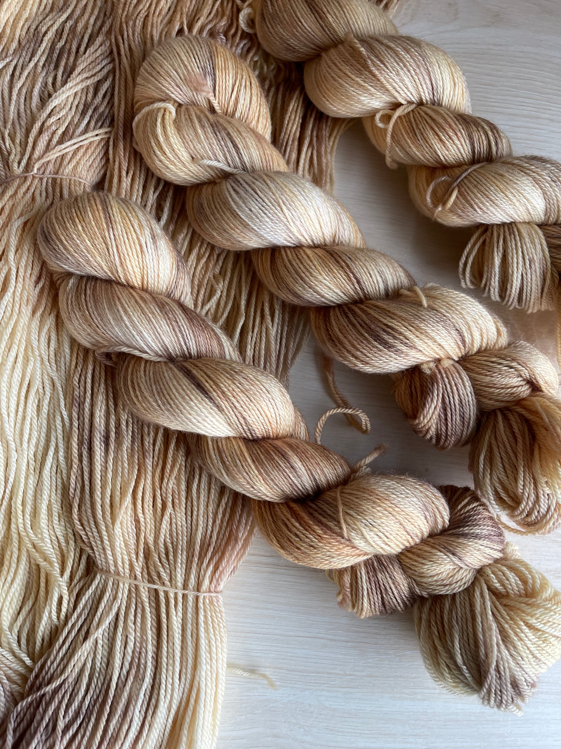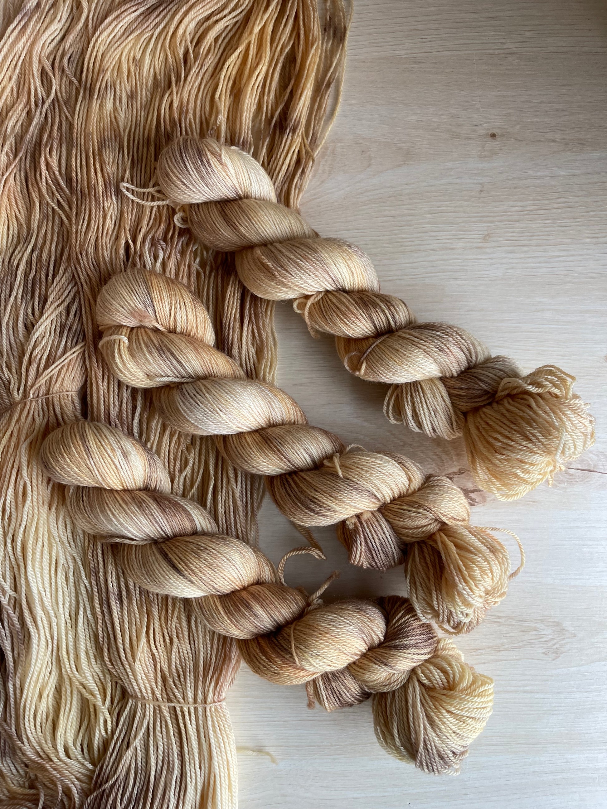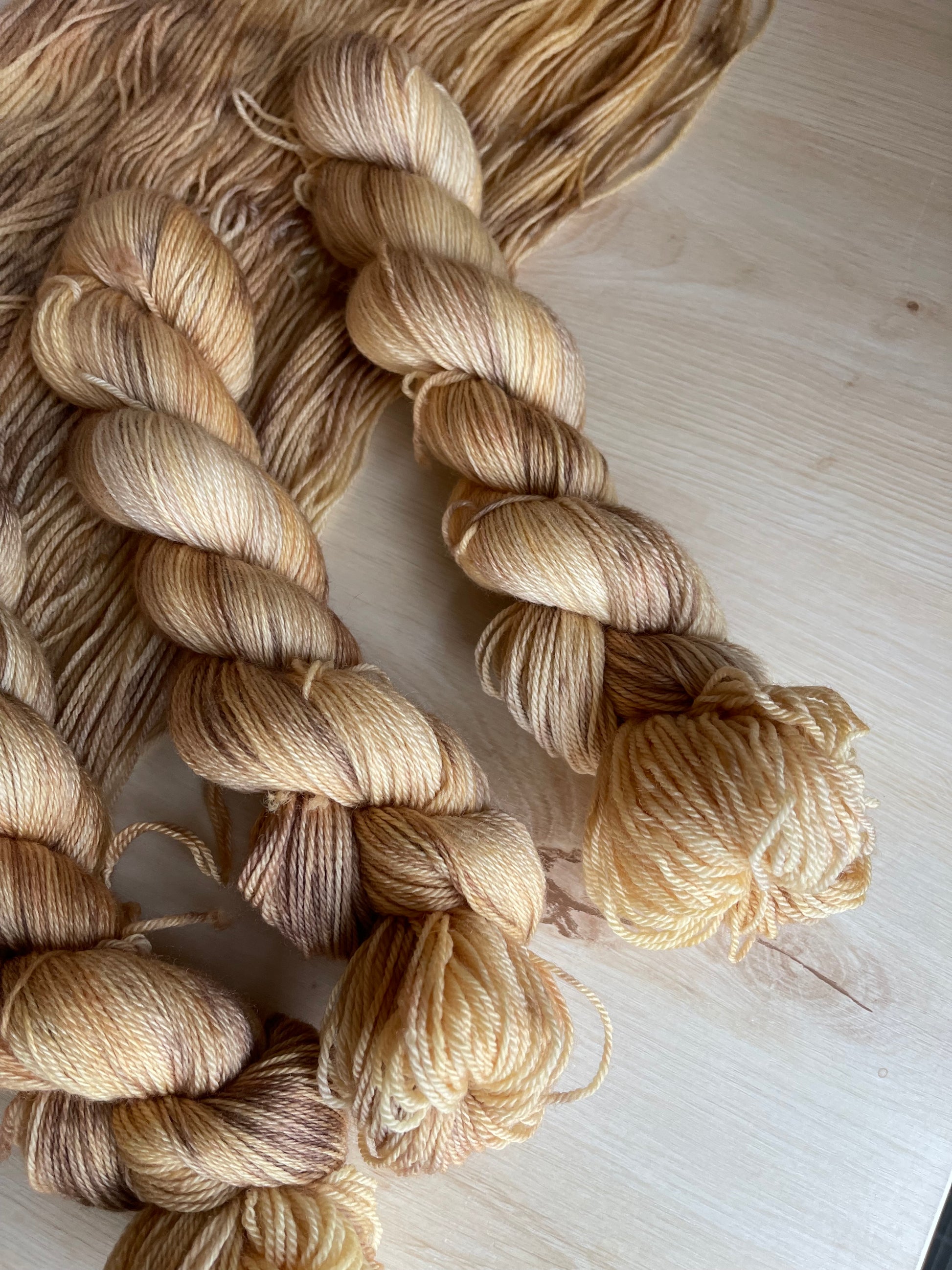 Alle Stränge wurden gründlich gewaschen, es kann jedoch sein, dass bei dunkleren Farben noch etwas Farbe verbleibt. Wasche deine handgefärbten Projekte daher beim ersten Mal separat in kaltem Wasser mit Hand.