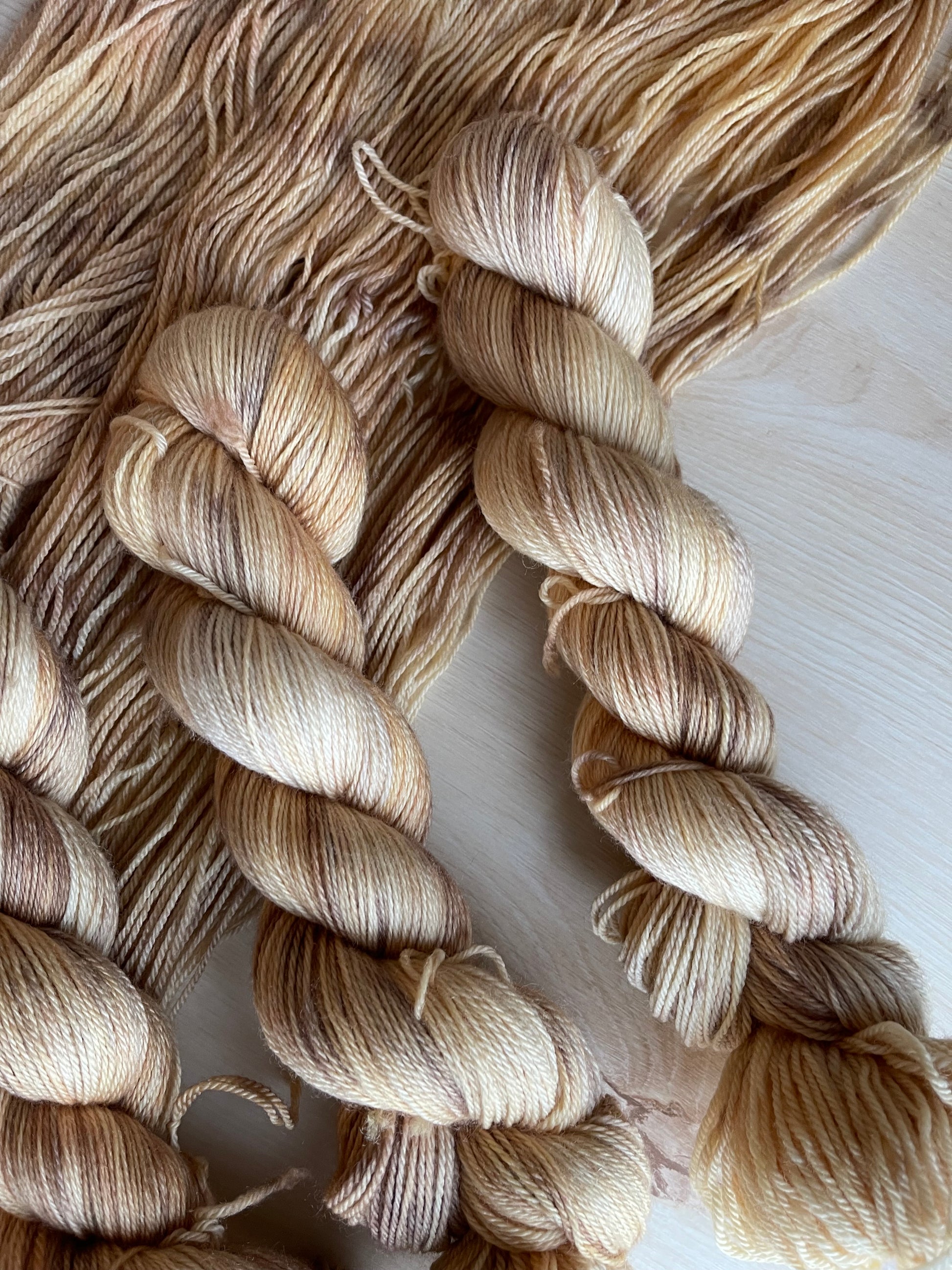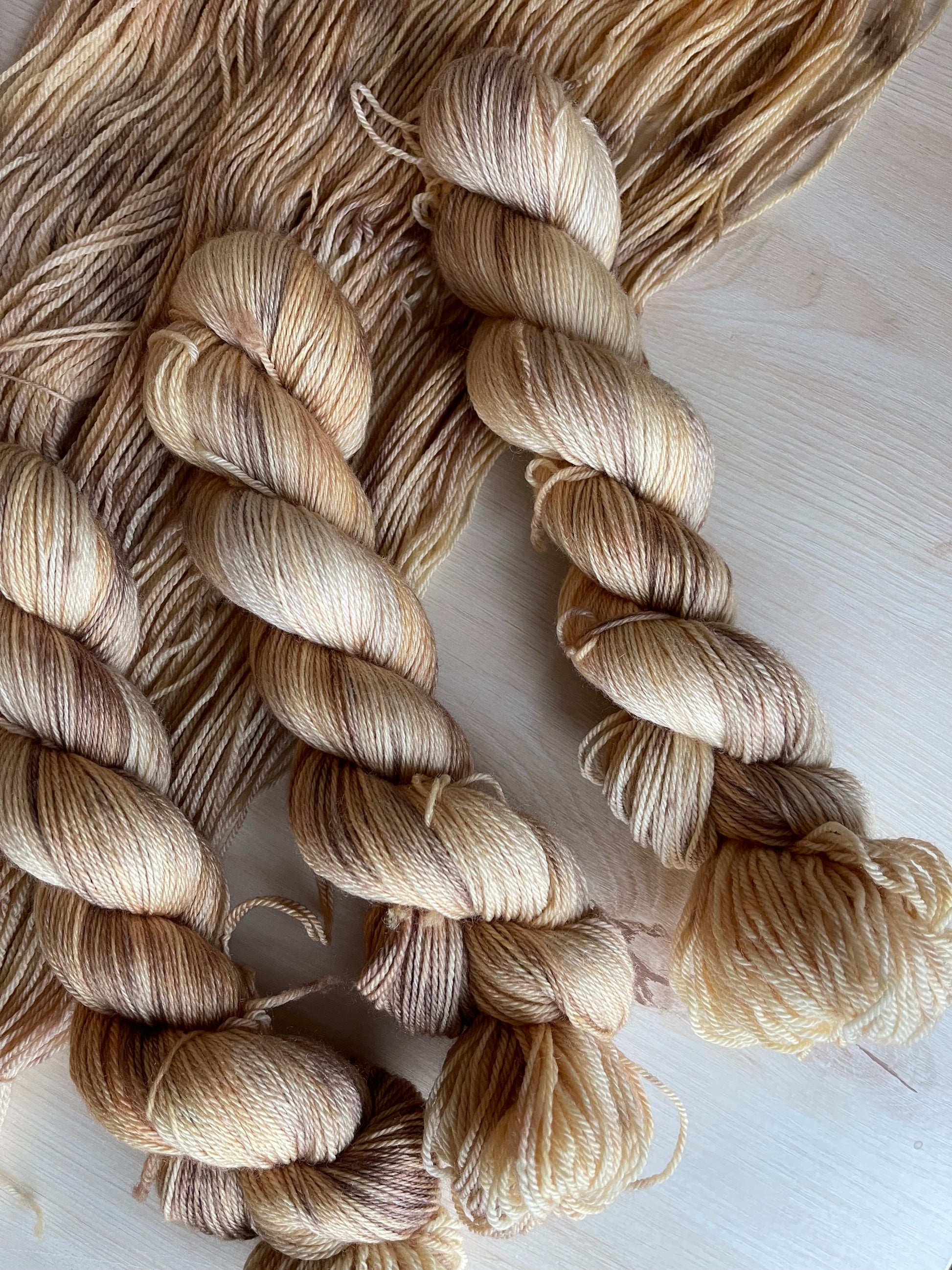 WICHTIGE HINWEISE: Achte darauf, genügend Wolle für dein Projekt auf einmal zu kaufen. Trotz meiner Bemühungen um eine gleichmäßige Färbung kann das Handfärben zu leichten Abweichungen in Farbe und Tiefe führen, auch innerhalb eines Batches.
