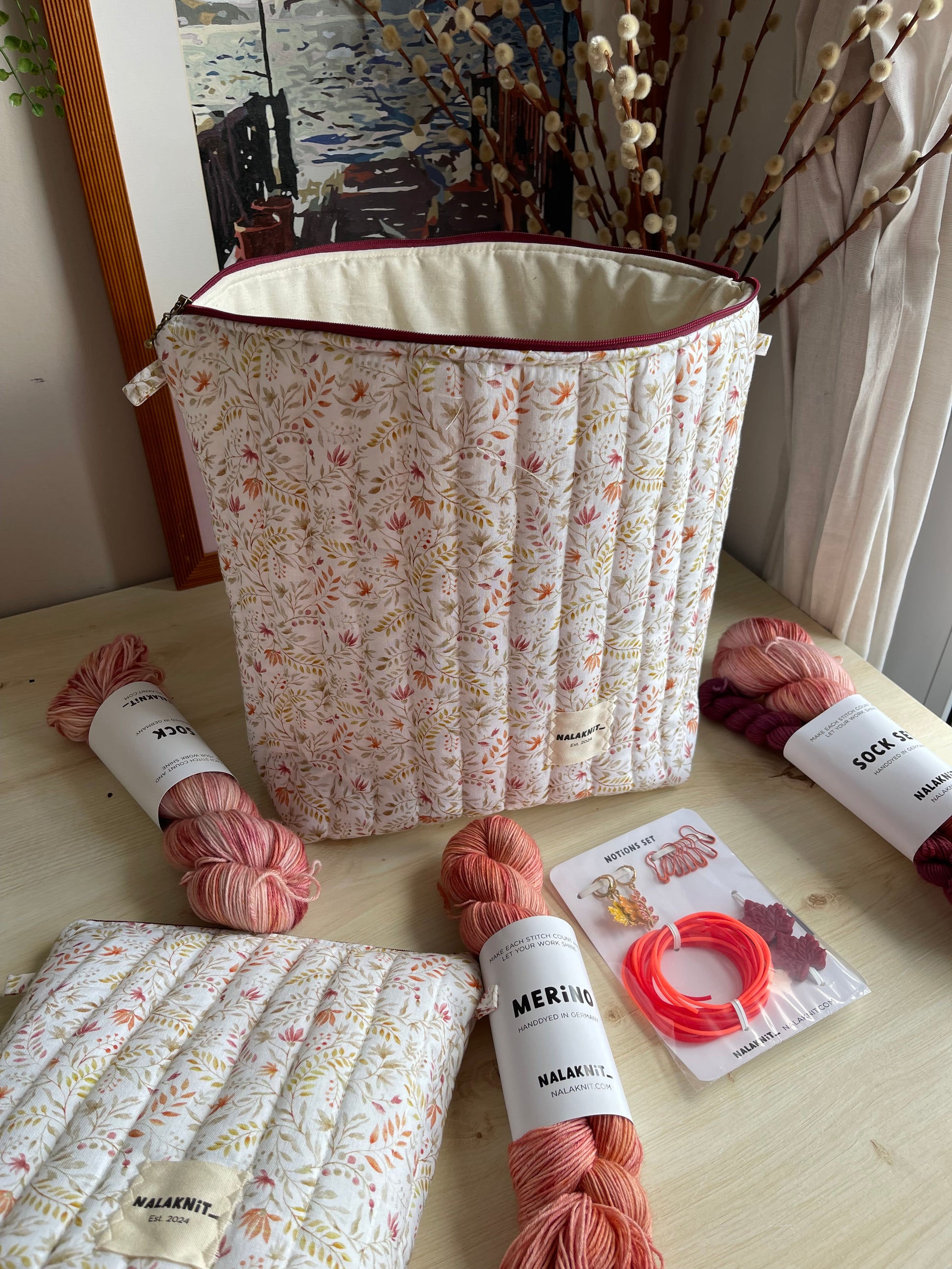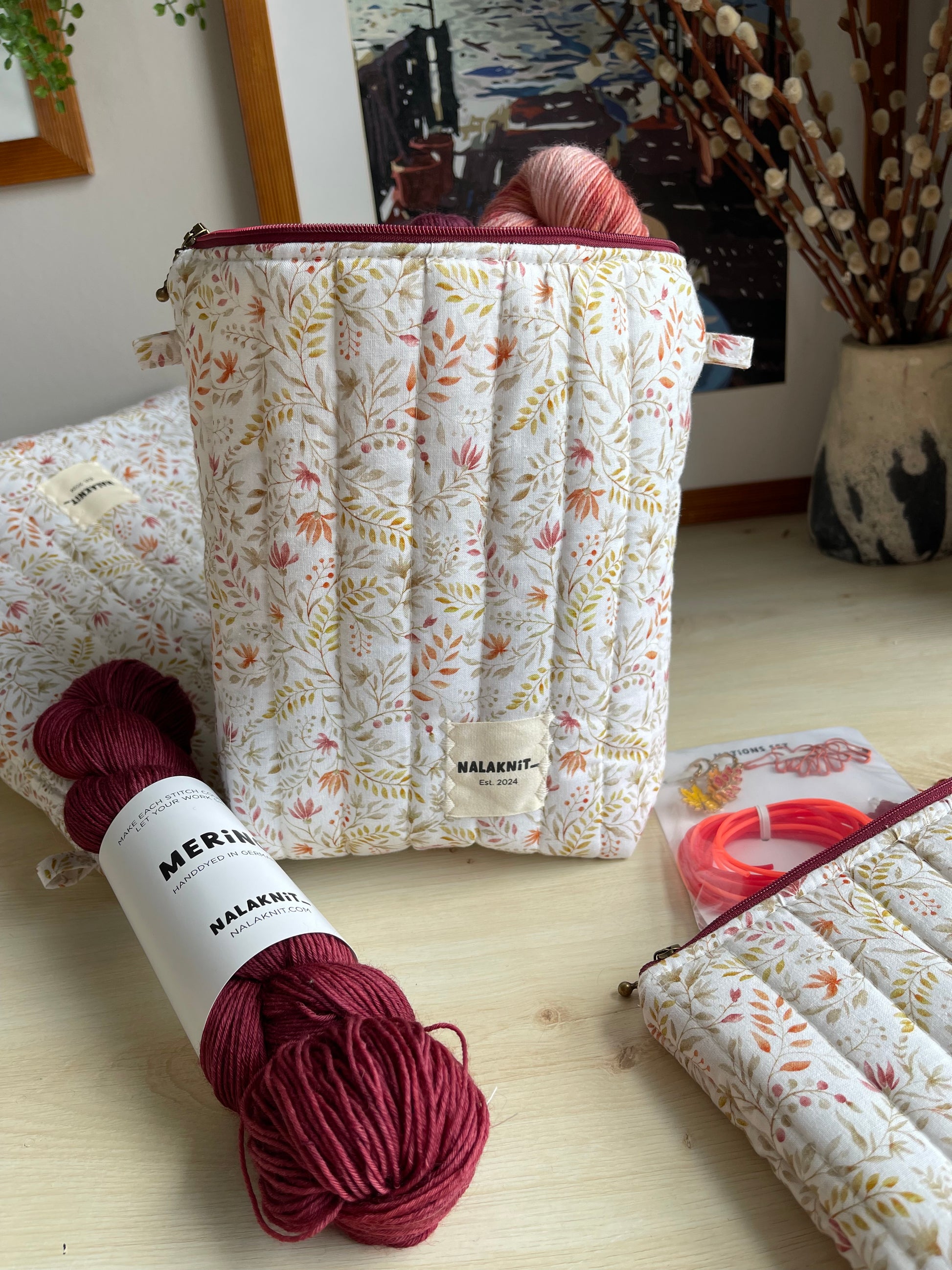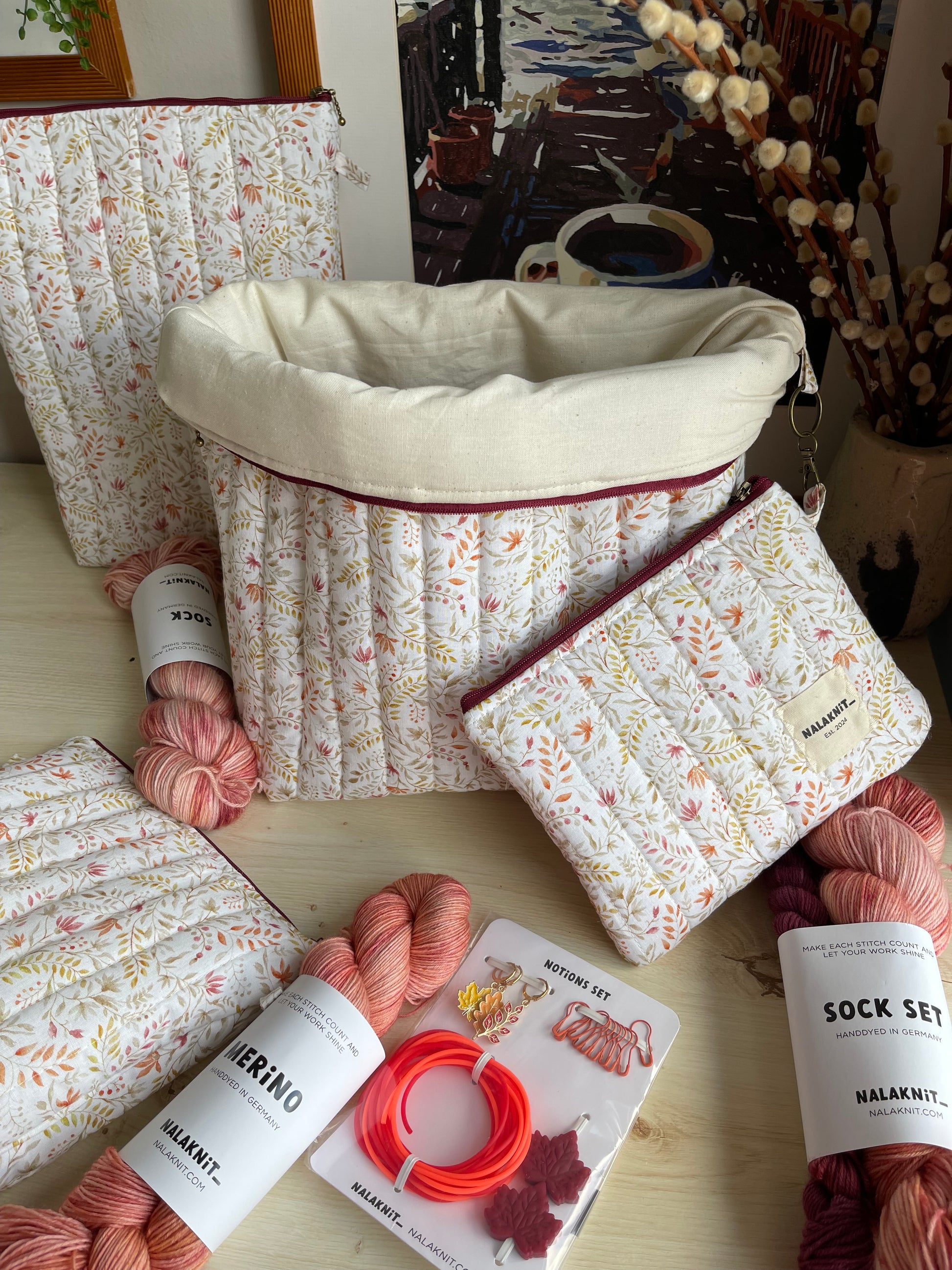 Die Projekttaschen sind mit einer Schaumeinlage gequiltet, wodurch sie besonders stabil sind und von selbst stehen können. Sie besitzen einen Reißverschluss, um sicherzustellen, dass nichts Wichtiges verloren geht. Im Inneren befindet sich eine Schlaufe mit Karabiner, an dem Zubehör wie Maschenmarkierer oder die passende Pouch befestigt werden können. Außen befinden sich zwei Schlaufen, an denen ein Schultergurt angebracht werden kann.