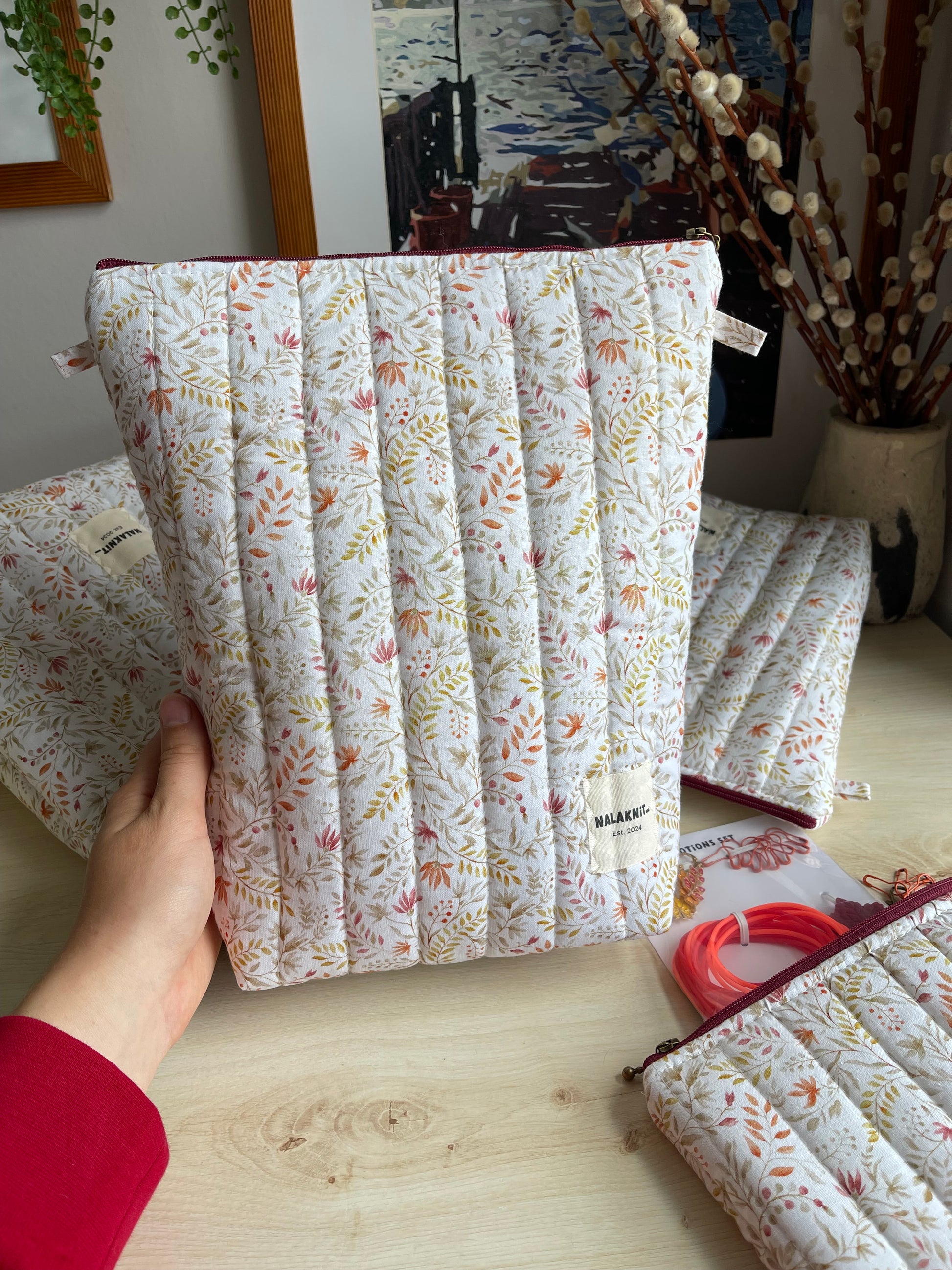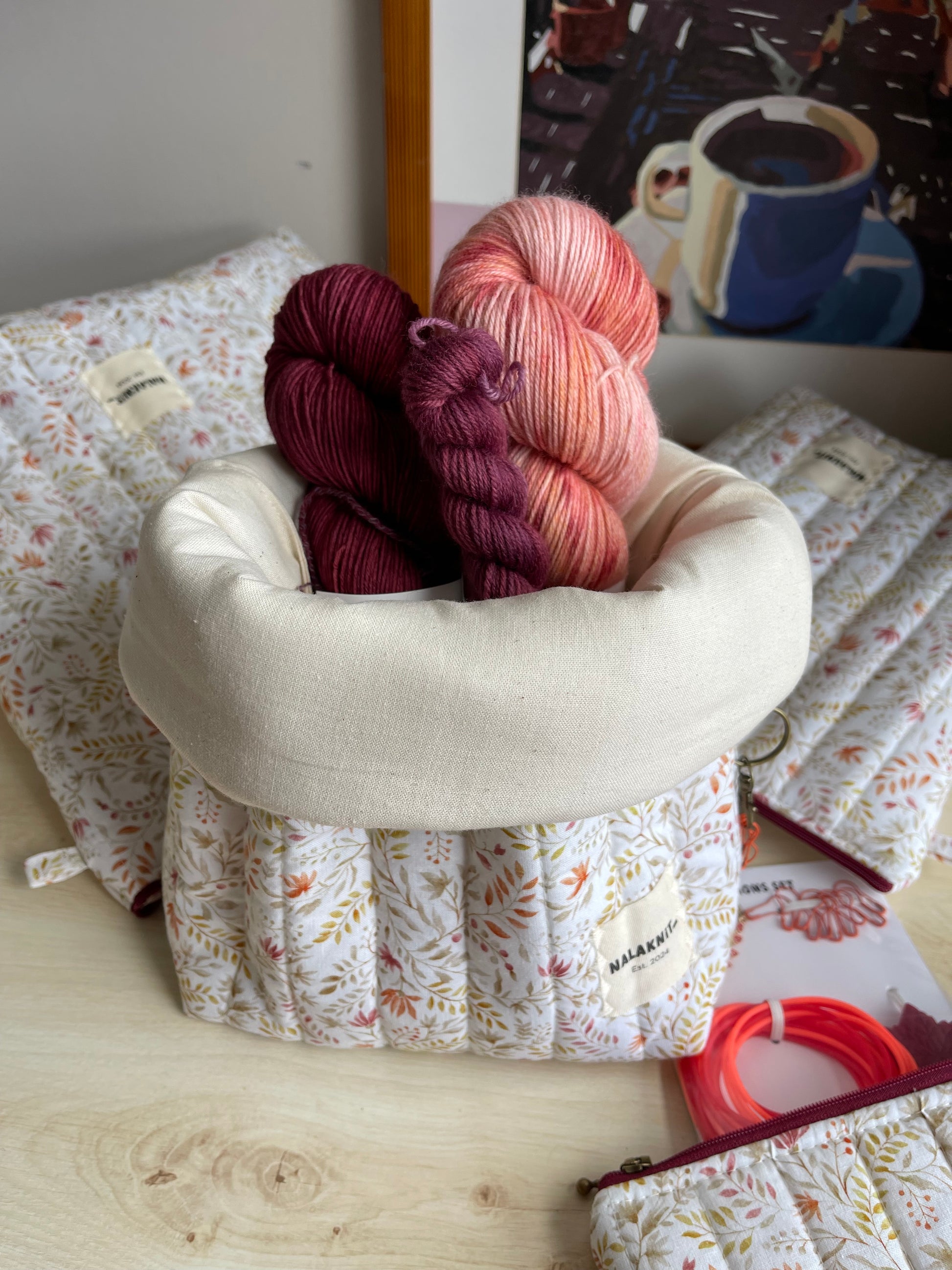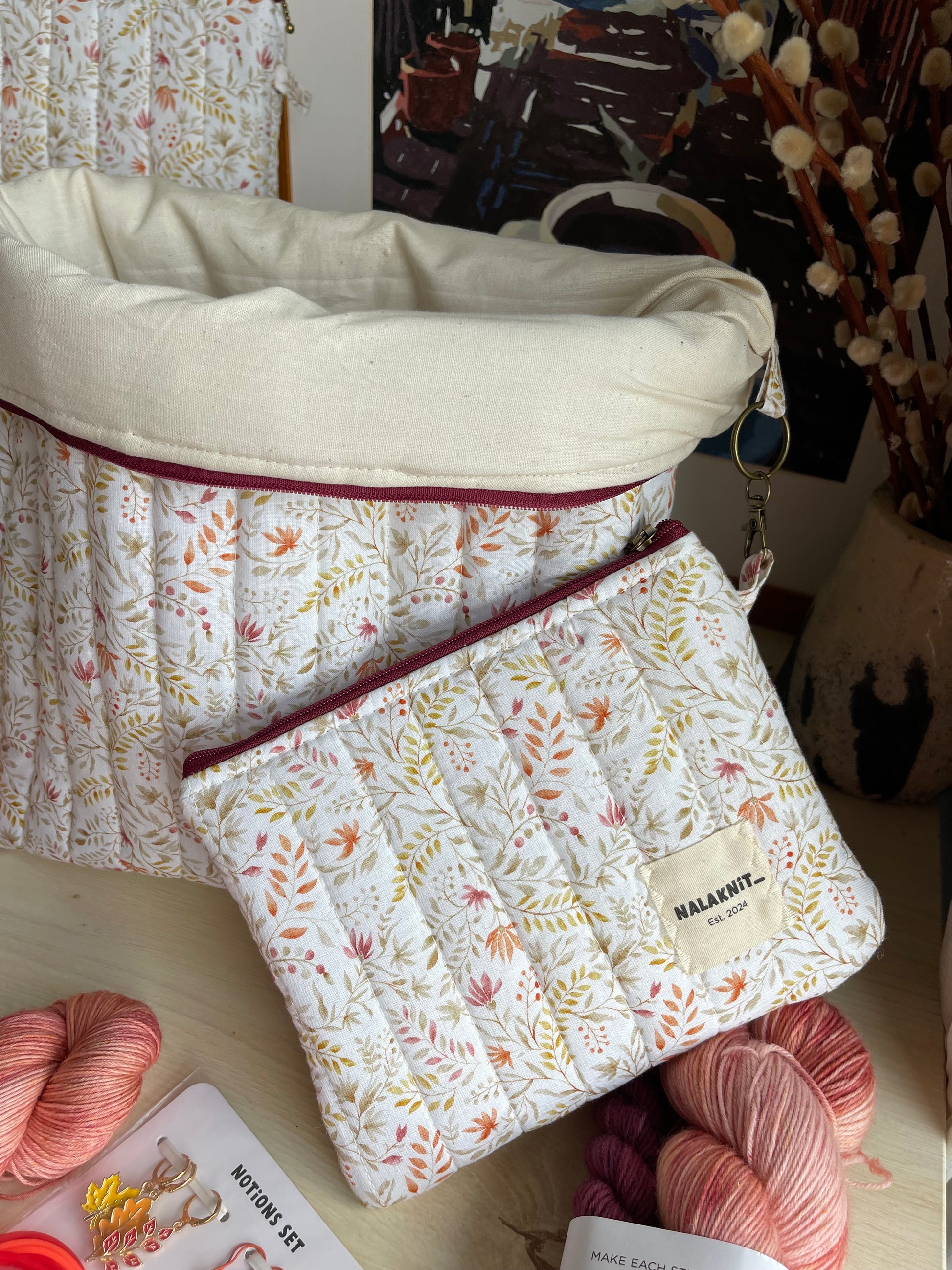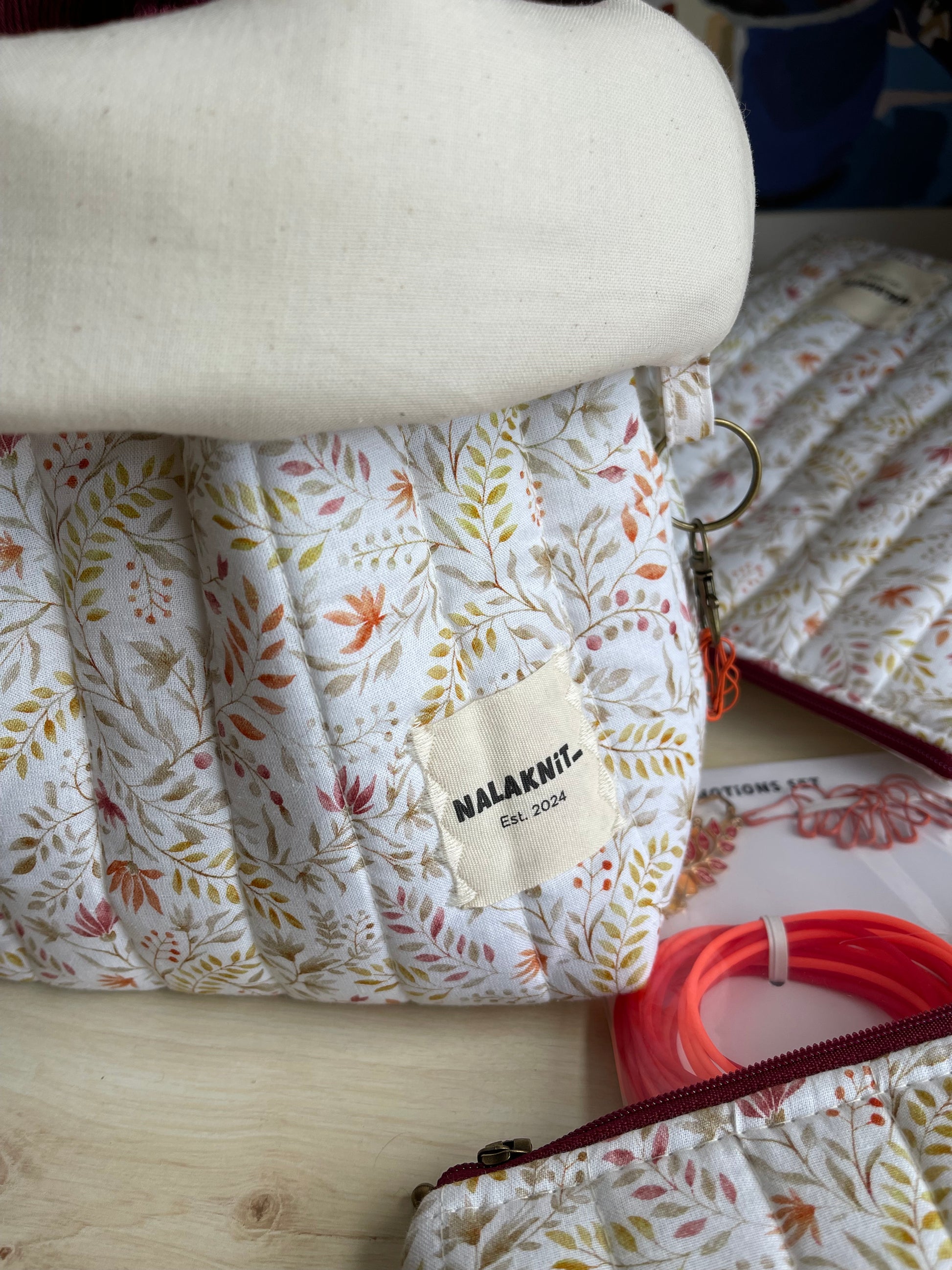 Die Projekttaschen sind mit einer Schaumeinlage gequiltet, wodurch sie besonders stabil sind und von selbst stehen können. Sie besitzen einen Reißverschluss, um sicherzustellen, dass nichts Wichtiges verloren geht. Im Inneren befindet sich eine Schlaufe mit Karabiner, an dem Zubehör wie Maschenmarkierer oder die passende Pouch befestigt werden können. Außen befinden sich zwei Schlaufen, an denen ein Schultergurt angebracht werden kann.