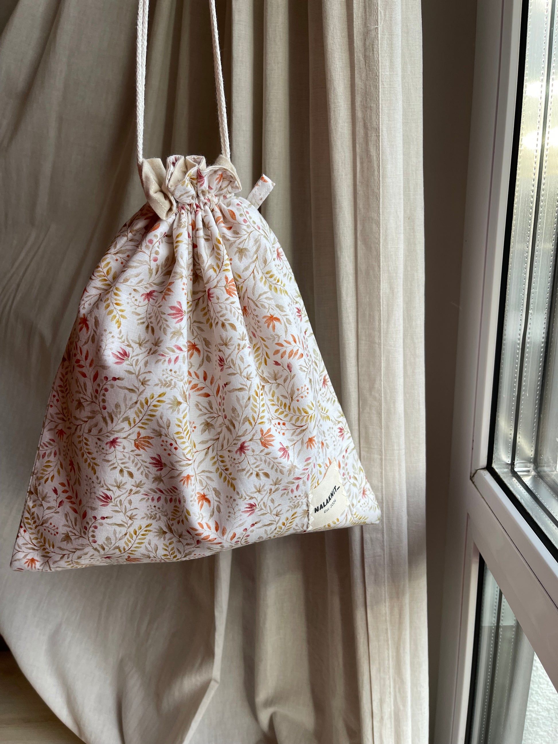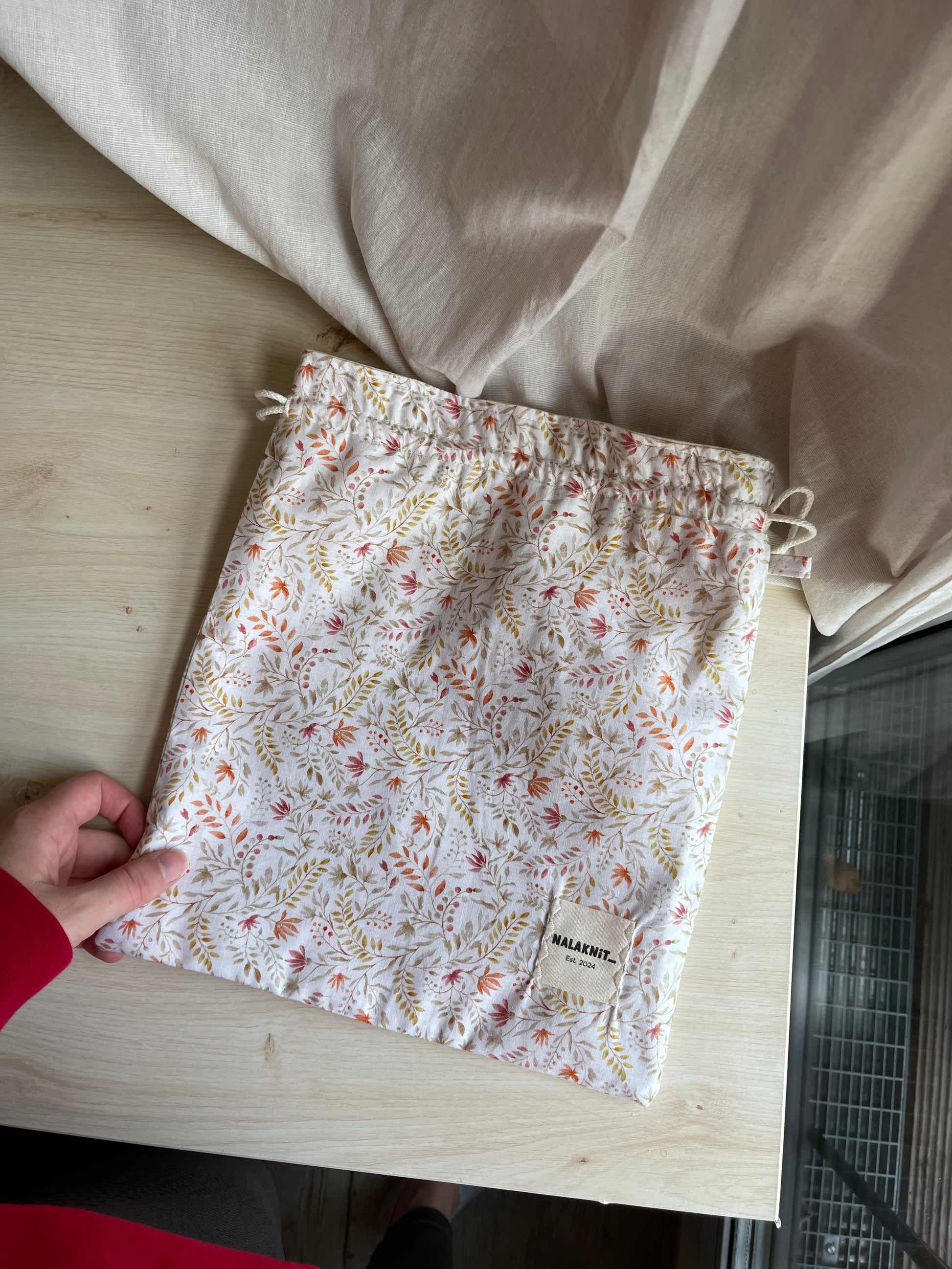 Die Zugbandbeutel sind selbstgenäht und eignen sich perfekt, um kleinere Projekte sicher zu verstauen und bequem zu transportieren. Sie können mit Kordeln zugezogen werden, wodurch nichts verloren geht und alles sicher an seinem Platz bleibt. Durch die doppelte Stofflage wirkt der Beutel besonders hochwertig, bleibt aber dennoch leicht und flexibel. So kann er problemlos in anderen Taschen verstaut werden, ohne unnötig viel Platz einzunehmen.