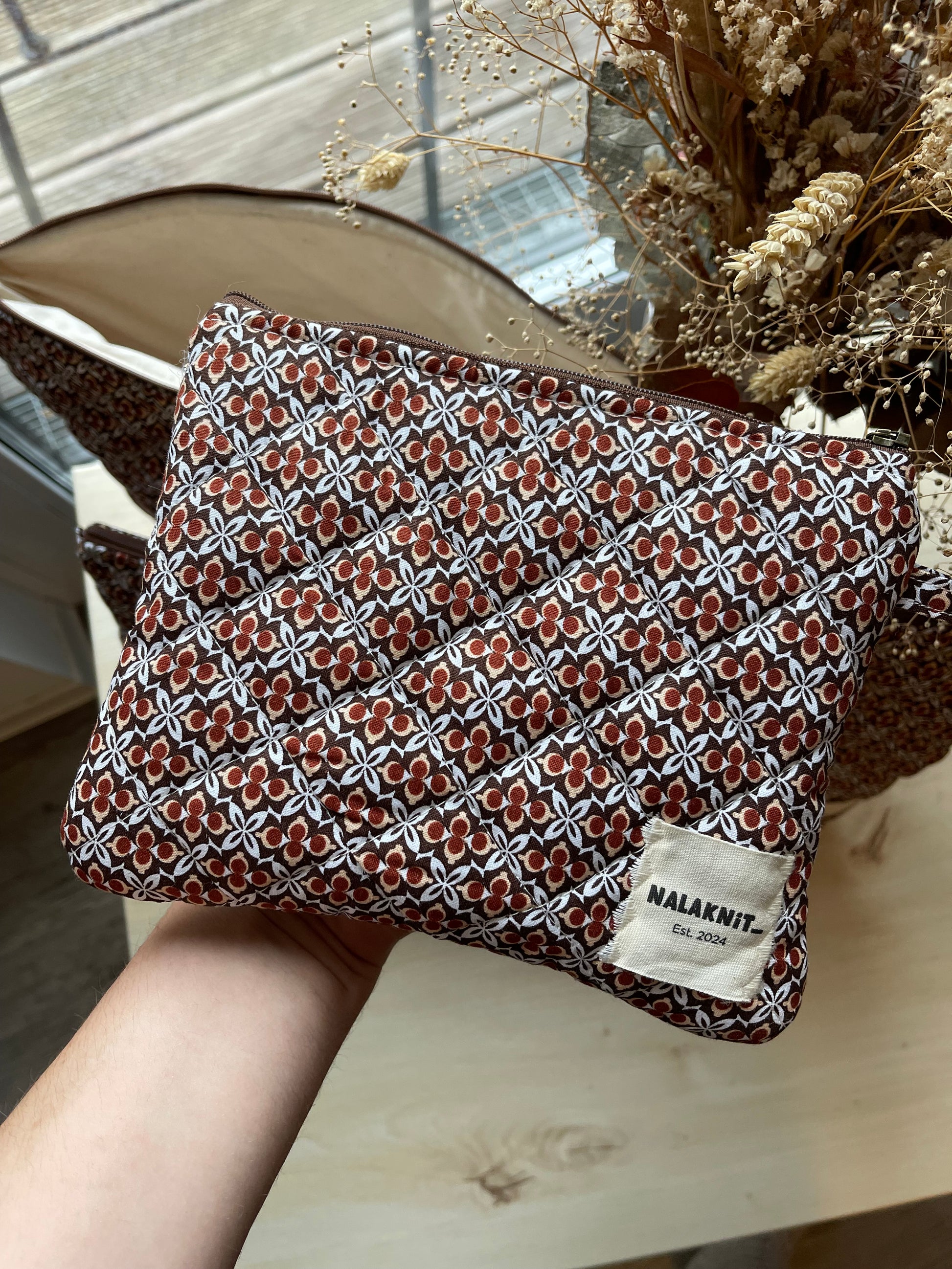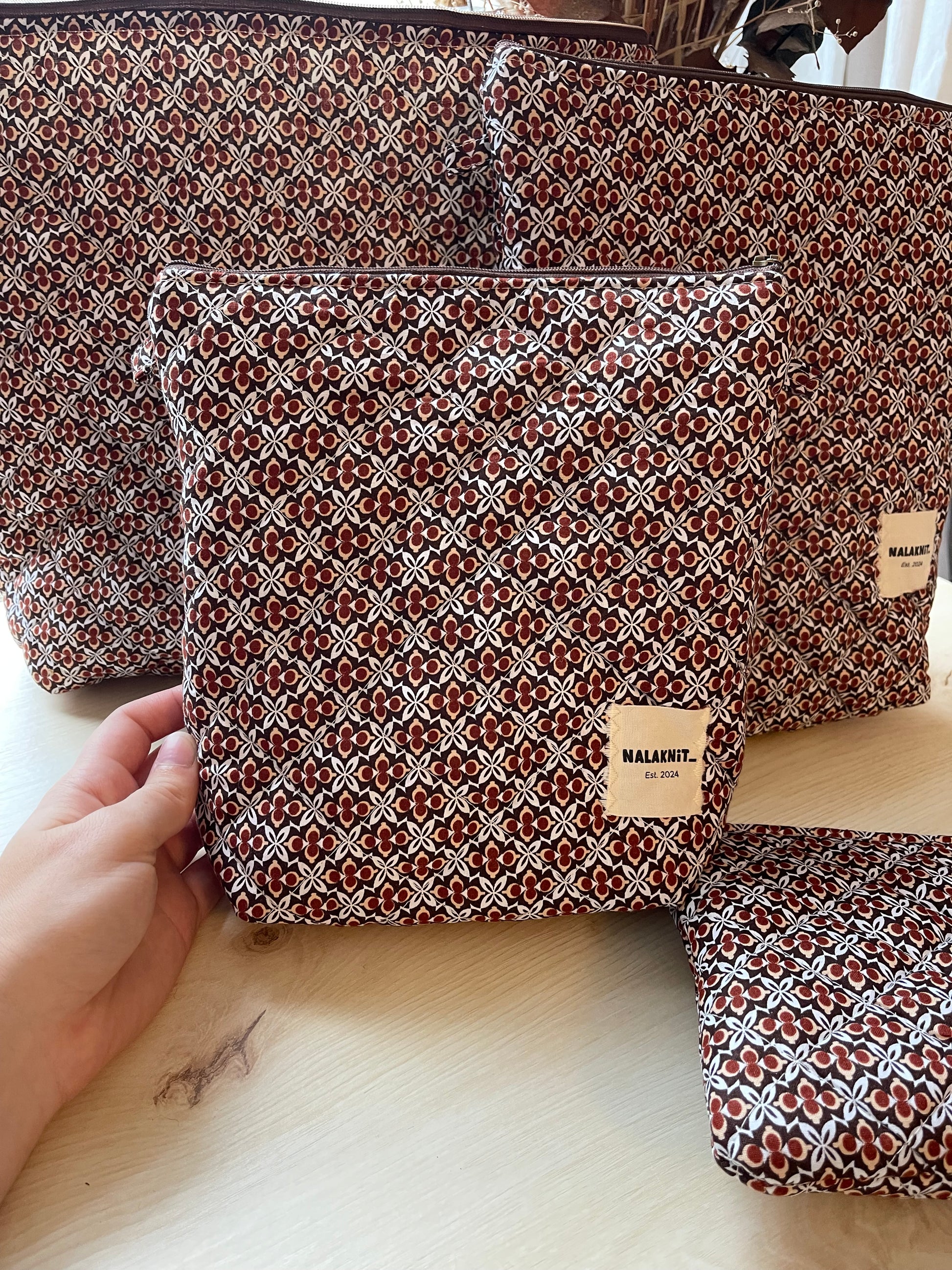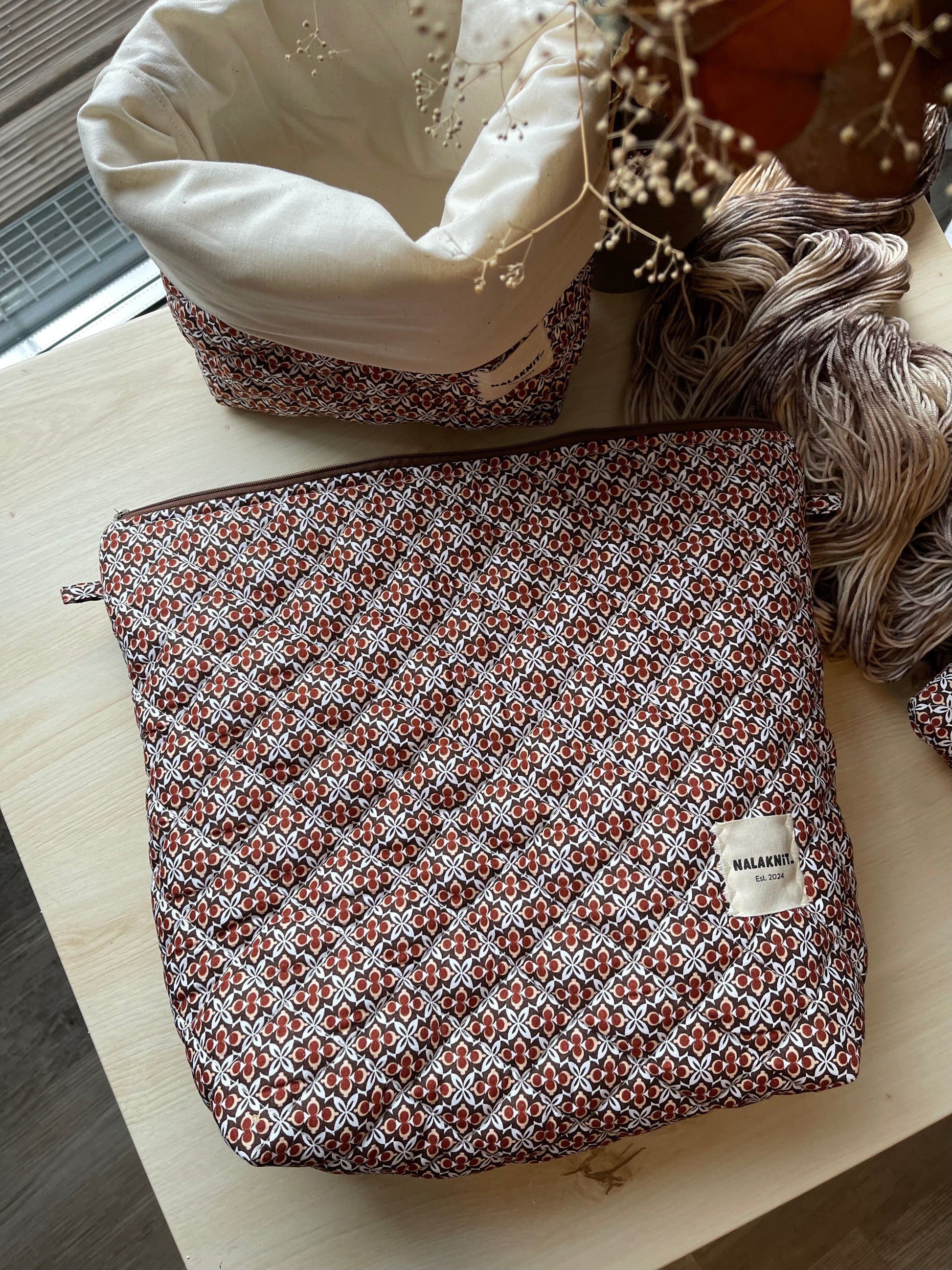Die Projekttaschen sind mit einer Schaumeinlage gequiltet, wodurch sie besonders stabil sind und von selbst stehen können. Sie besitzen einen Reißverschluss, um sicherzustellen, dass nichts Wichtiges verloren geht. Im Inneren befindet sich eine Schlaufe mit Karabiner, an dem Zubehör wie Maschenmarkierer oder die passende Pouch befestigt werden können. Außen befinden sich zwei Schlaufen, an denen ein Schultergurt angebracht werden kann.