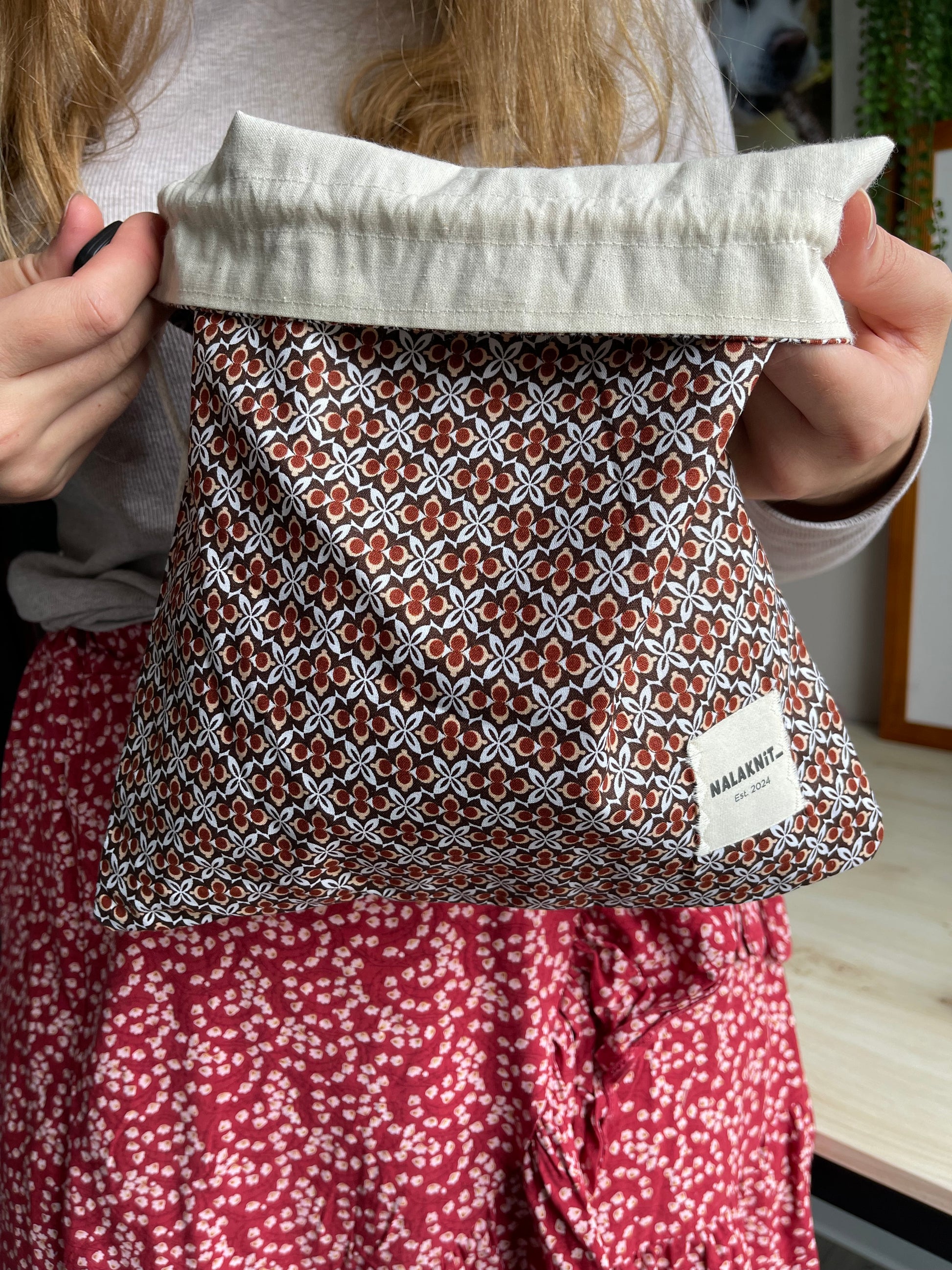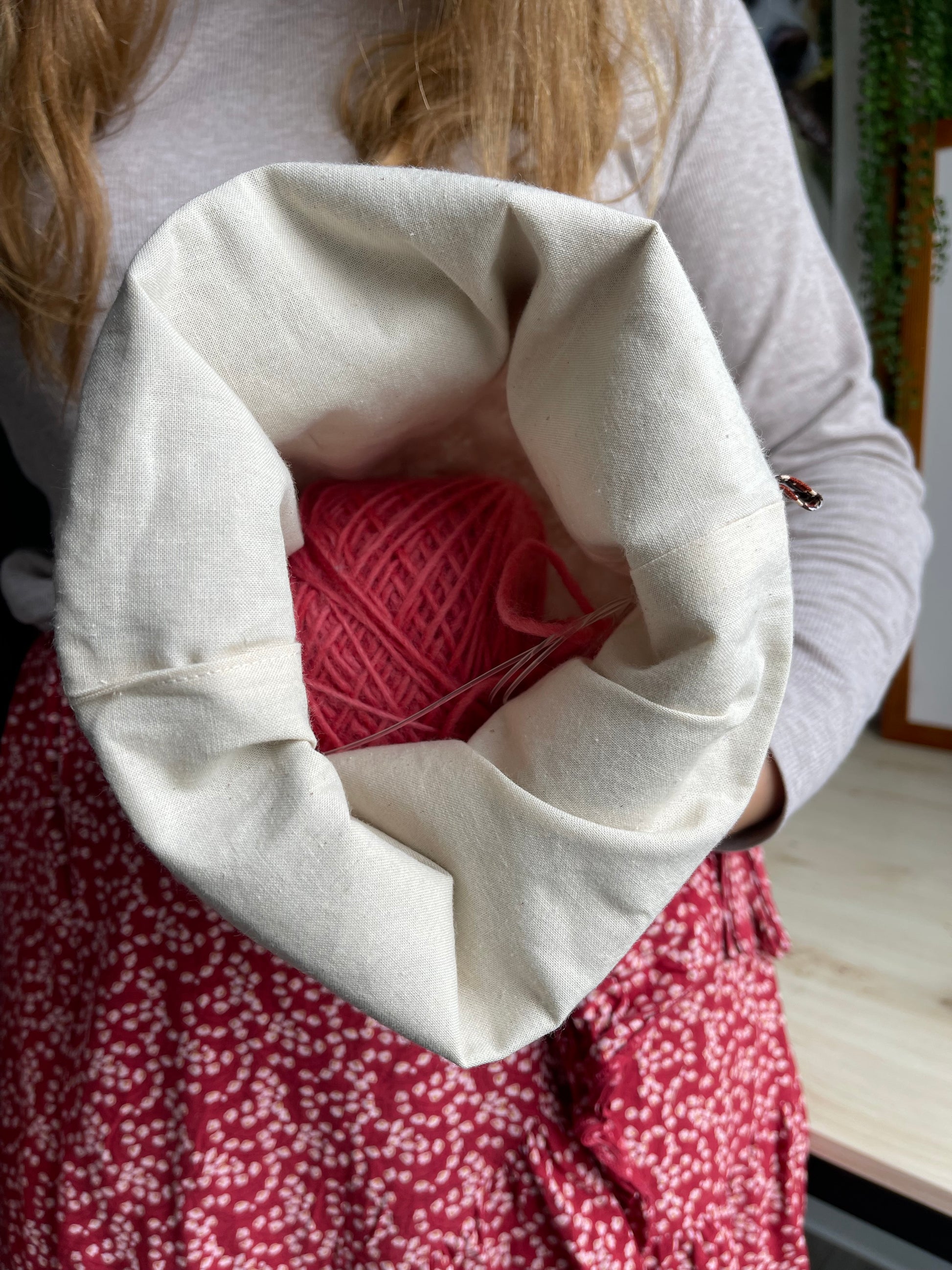 Die Zugbandbeutel sind selbstgenäht und eignen sich perfekt, um kleinere Projekte sicher zu verstauen und bequem zu transportieren. Sie können mit Kordeln zugezogen werden, wodurch nichts verloren geht und alles sicher an seinem Platz bleibt. Durch die doppelte Stofflage wirkt der Beutel besonders hochwertig, bleibt aber dennoch leicht und flexibel. So kann er problemlos in anderen Taschen verstaut werden, ohne unnötig viel Platz einzunehmen.